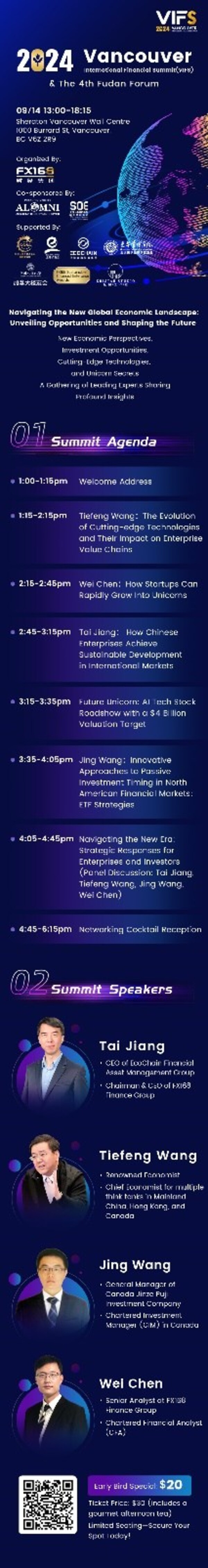 VANCOUVER,BC,Sept. 10,2024 -- In the ever-evolving global economy,challenges and opportunities coexist,leaving investors to ask: how can one stay ahead in such a dynamic market? The 2024 Vancouver International Financial Summit (VIFS) and the 4th Fudan Forum will be held on September 14 at the Sheraton Vancouver Wall Centre. This event promises to bring you to the heart of global economic and investment trends,offering cutting-edge insights and uncovering promising investment opportunities.