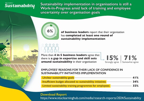 SINGAPORE,Sept. 19,2024 --Although sustainability is a growing business priority,only 6% of business leaders report that their organisation has completed at least one round of sustainability implementation. This is in comparison to 14% from NTUC LearningHub's Special Report on Sustainability 2022. Nevertheless,a positive outlook remains as nearly three quarters of business leaders (72%) share that their organisation will begin its sustainability journey within the next five years or more,marking a 6% increase from the 2022 report.