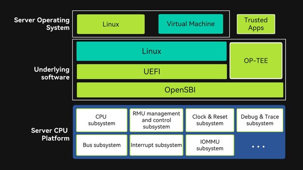 Based on the self-developed server CPU chip platform,the development of server platform firmware that complies with the RISC-V BRS Spec specification has been completed. This includes openSBI/UEFI (BIOS)/Linux and other low-level software that meets the requirements of the Supervisor Binary Interface (SBI),UEFI (BIOS),SMBIOS,ACPI,and other specifications. The Linux operating system has been adapted and ported,and it supports the GlobalPlatform-standard OP-TEE secure operating system. The platform firmware and operating system can now be successfully run and demonstrated on an FPGA of the server CPU chip platform.
