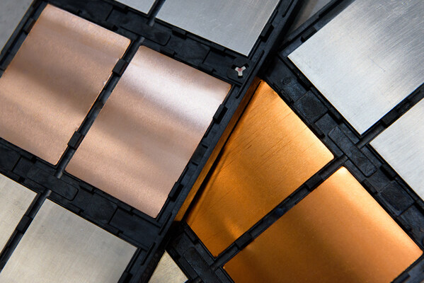 Comparison of copper plates treated in the REDOX-Tool (left) and oxidized copper plates (right). The difference between the copper plates without and with oxide layer is clearly visible. (Copyright: Plasmatreat GmbH)