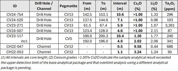 With the geological and block models for the CV5 Pegmatite now handed off to the Feasibility Study team,the Company has further reviewed its core assay dataset and identified multiple distinct areas of considerable cesium (Cs) enrichment (>1% Cs). These include the CV5 and CV12 pegmatites; however,the two (2) largest zones are hosted by the CV13 Pegmatite. Cesium results in drill hole and channel (Figure 1,Table 1,and Table 2) include:
