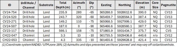 Results for pegmatite intervals <2 m are not reported.