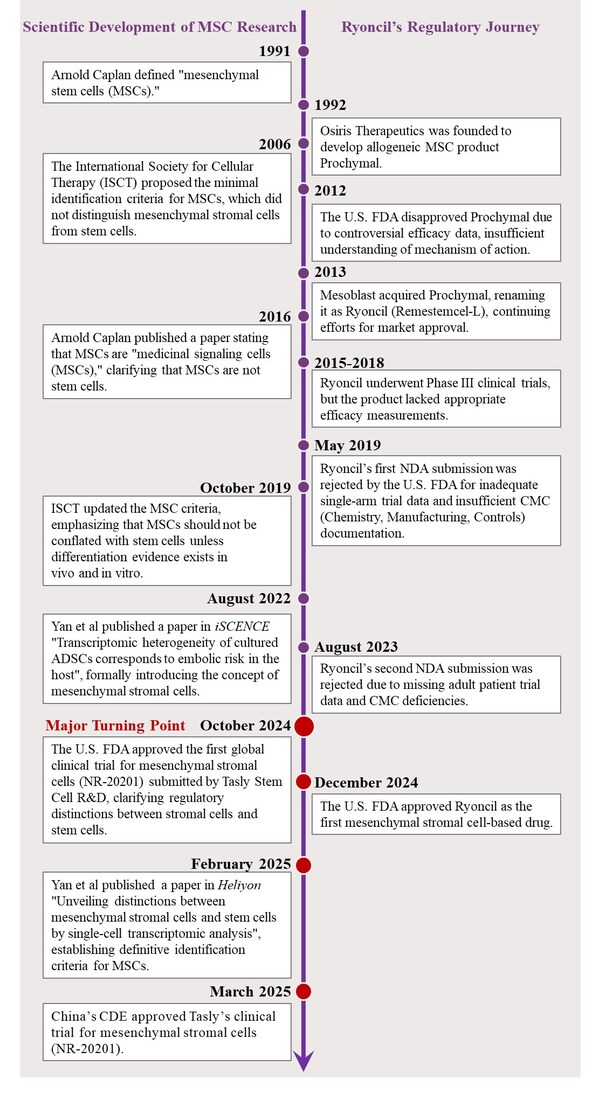 October 2024,the U.S. FDAgreenlighted the first clinical trial for awell-defined mesenchymal stromal cell (MSC) therapy submitted by Tasly Stem Cell Research team,led by Dr. Kaijin Yan,marking a paradigm shift from confounded stem cell therapy to authentic MSC therapy [6]. This would trigger a series of chain reactions in cell therapy regulation.