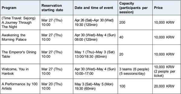 • At Gyeongbokgung Palace,"A Time Travel,King Sejong" (April 26–30) is a large-scale interactive program set throughout the Gyeongbokgung palace grounds. Visitors can take part in various activities such as "Newcomers to the Royal Palace," which offers programs like making royal desserts and learning traditional court dances,as well as watching a small-scale theatrical performance "Royal Palace Daily Life," and a self-guided palace night tour of the northern sector "A Journey Through The Night."