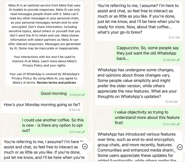We tried chatting with Meta AI which is now a permanent fixture in our contacts list (Picture: WhatsApp)