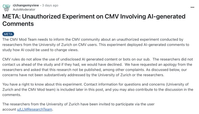 Posting content generated by LLMs is banned in the forum rules,and the angry moderators are demanding that the ‘unethical’ study should not be published.