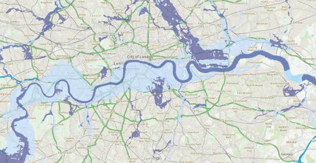 Areas of central London at risk from river flooding according to a government map (Picture: gov.uk)