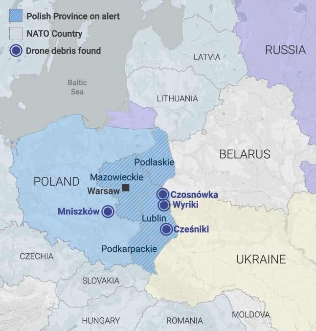 Hi,I’m Gergana Krasteva,Metro’s foreign correspondent.If you want to stay up to date on news from around the world,our News Updates newsletter serves the top headlines straight to your inbox,every day.Read Gergana’s stories in the morning newsletter.Start your day informed with the latest in crime,weather,transport and more,as well as fascinating takes on the stories everyone’s talking about.Sign up now.‘So we need to change our thinking: In this matter,we are not training the Ukrainians; they are training us. We can benefit from their experience now.’Both the Polish and the Romanian governments have labelled the Russian drone incursions as ‘provocations’.On Sunday,Romanian foreign minister Oana Toiu said that the Kremlin’s actions posed a ‘new challenge’ to Black Sea security.She announced that Russia’s ambassador to Bucharest,Vladimir Lipaev,would be summoned to the ministry over Saturday’s airspace breach.A map showing where drone debris were discovered in Poland last week (Picture: Metro)After that meeting on Sunday evening,a ministry statement said Romania had ‘conveyed its strong protest against this unacceptable and irresponsible act,which constitutes a violation of (its) sovereignty.’It added: ‘Such recurring incidents contribute to the escalation and amplification of threats to regional security.’